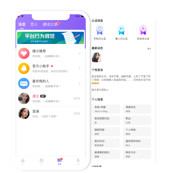 【多重认证】真人、实名双重认证,智能机审+人工复审,头像就是本人,你约见的TA就是真实的TA。
